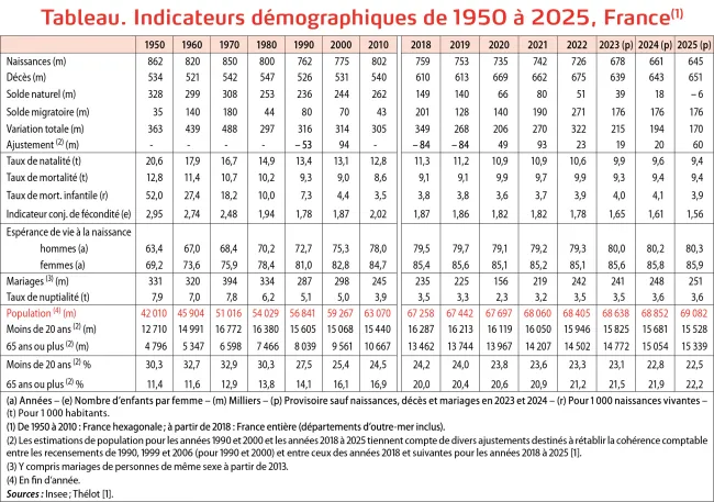 Au 1er janvier 2026, la population de la France est estimée à 69,1 millions d’habitants, dont 66,8 millions en France hexagonale et 2,3 millions dans les départements d’outre-mer [1]. La population a augmenté de 0,25 % en 2025 (tableau). Le solde naturel, différence entre le nombre de naissances et de décès, est négatif pour la première fois depuis la fin de la seconde guerre mondiale. En 10 ans il est passé de + 205 000 (en 2015) à – 6 000 (en 2025). Sa baisse vient pour les trois quarts d’une diminution des naissances (154 000 en moins) et pour un quart d’une hausse des décès (57 000 en plus).